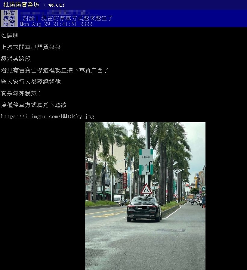 一名網友在論壇《PTT》以「現在的停車方式越來越狂了」為題發文,原PO表示,上週末開車出門買菜經過某路段,發現一台賓士車停在分隔島前就下車買東西,畫面中可見,這台黑色賓士車臨停在分岔路的分隔島前,不知情的人或許會以為是發生車禍,猜想駕駛在想要走左邊還是右邊,原PO怒說「害人家行人都要繞過他,真是氣死我了!這種停車方式真是不應該」。