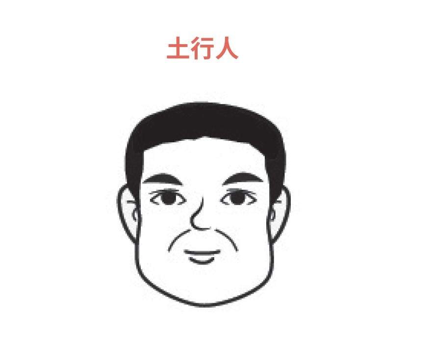 最後我們來看「土行人」,土就是非常的厚重,所以當你看到,一個人的臉肉很多,但又不是圓,看起來很重,就是土行人的特色,土行人很容易包容大家,性格相對比較穩重,然後耐性也比較強。土行人比較能夠承受長時間的計劃和策略,然後也能等待,所以對於長期性的成功,他們是比較容易達成的,一般土行人早年都不容易發,晚年比較容易發,面相上他們整個下巴的肉比較多,臉型通常是偏梯形的,所以額頭不會很寬廣,他們事業到中晚年的時候,會變得非常大,尤其越晚年,事業就會越大。很多人問說,「老師,我分不出來水行人跟土行人?」其實水行人跟土行人,都是屬於胖子,他們共同特色都是沒有脖子。但是一個是靈活的胖子,一個是緩慢的胖子,所以如果遇到脖子很短的人,那你就可以推測他到底是水行人還是土行人。