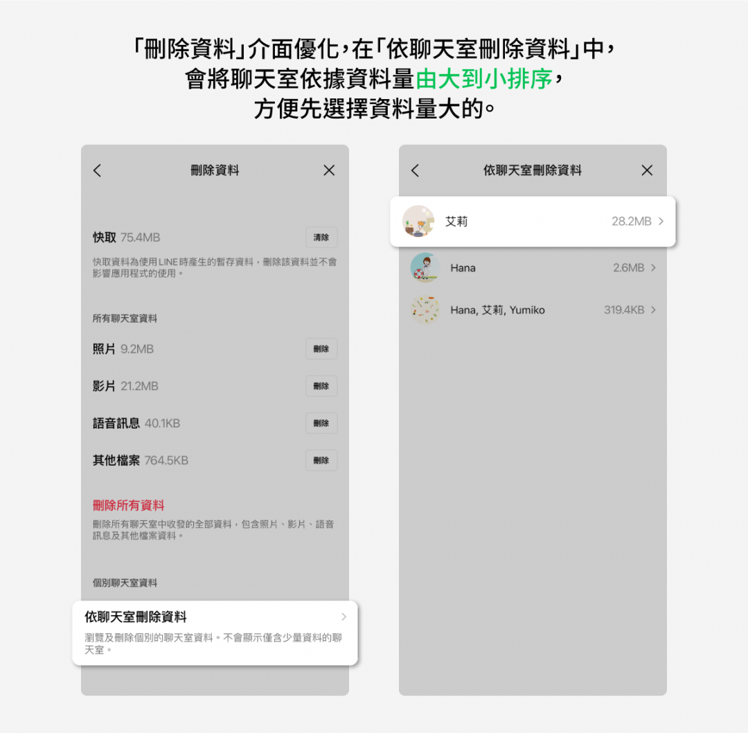 LINE聊天室內的影片、照片及各個檔案都會占據手機記憶體容量,而在最新版本的設定欄位中,文字說明及分類變得比先前更簡單好懂,而且還可以針對特定內容進行刪除,完全不用害怕誤刪資料。