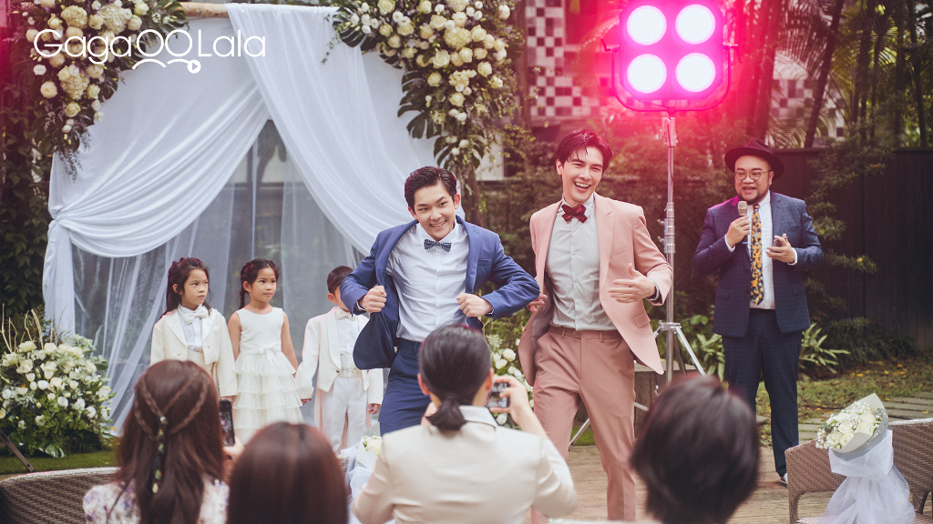 另一方面,時尚YouTuber布萊恩為兩位準新人設計起別出心裁的婚紗之外,還準備了驚世駭俗的SM風格皮革摟空比基尼,讓好友們很是期待。Damian邊扭動性感身軀邊說:「拜託,跟我Baby比的話,我比較辣吧」!傑立聽聞嚇得花枝亂顫,趕緊出言制止:「你們不要鬧了!到時候會有很多長輩在場,不好看啦」!最後,兩人穿著布萊恩精心準備、企圖突破性別框架而訂製的粉色西裝,在眾人的祝福之下於三級古蹟「台北之家」舉行盛大婚禮。