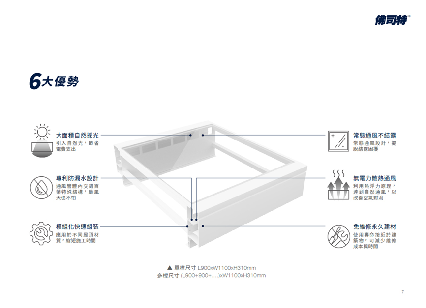 建築物載體除去最基本的居住安全外,最為重要的需求便是採光與通風。而過往業界窗體皆未能有重大創新,直至佛司特金屬看見其商機,投入技術資金開發專利產品──佛司特採光通風窗系列,將自然採光、散熱通風兩大功能整合在單一建材上。