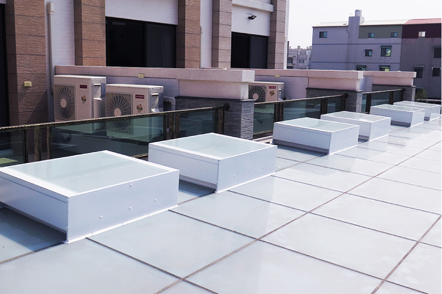 應對各式場合安裝天窗的需求,《採光通風天窗》的結構朝能安裝於各場合的方向設計,舉凡各類不同的鐵皮浪板工廠、透天別墅天井、樓梯間等場域,皆能有效將光源帶入室內,讓室內空間有效節省燈源消耗的成本。