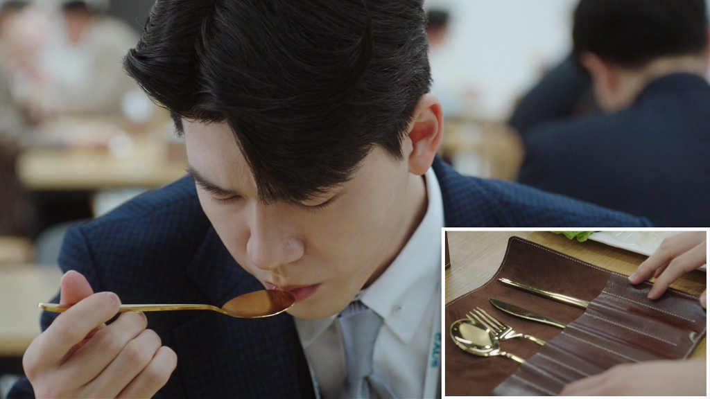 ▲ 富二代白馬帥(裴賢聖 飾)為了體驗平民生活,並擺脫父母掌控特意到敵對公司「高斯電子」當小職員,出場時乘坐降落傘,吃飯時拿出金湯匙,這不就是一般大眾對有錢人的「偏見」嗎?(圖:龍華電視)