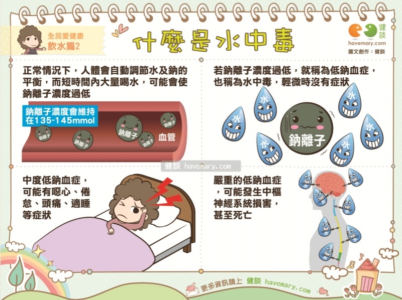 若鈉離子濃度過低,就稱為低鈉血症,也稱為水中毒,輕微時沒有症狀。