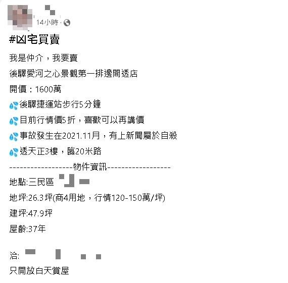 高雄1名房仲近日在臉書社團「我是凶宅!!買賣/法拍/投資/撿便宜/屋主自租自售/仲介/資訊新聞/全台/禁廣告只有凶宅可進」PO出凶宅資訊,該戶位於後驛愛河之心景觀第一排的邊間透店,是屋齡37年的透天3層樓,地坪26.3坪(商4用地),後驛捷運站只需步行5分鐘,目前開價1600萬元。由於去年11月曾發生事故,已經按照行情價再打5折,有興趣者仍可議價,並強調「只開放白天賞屋」。