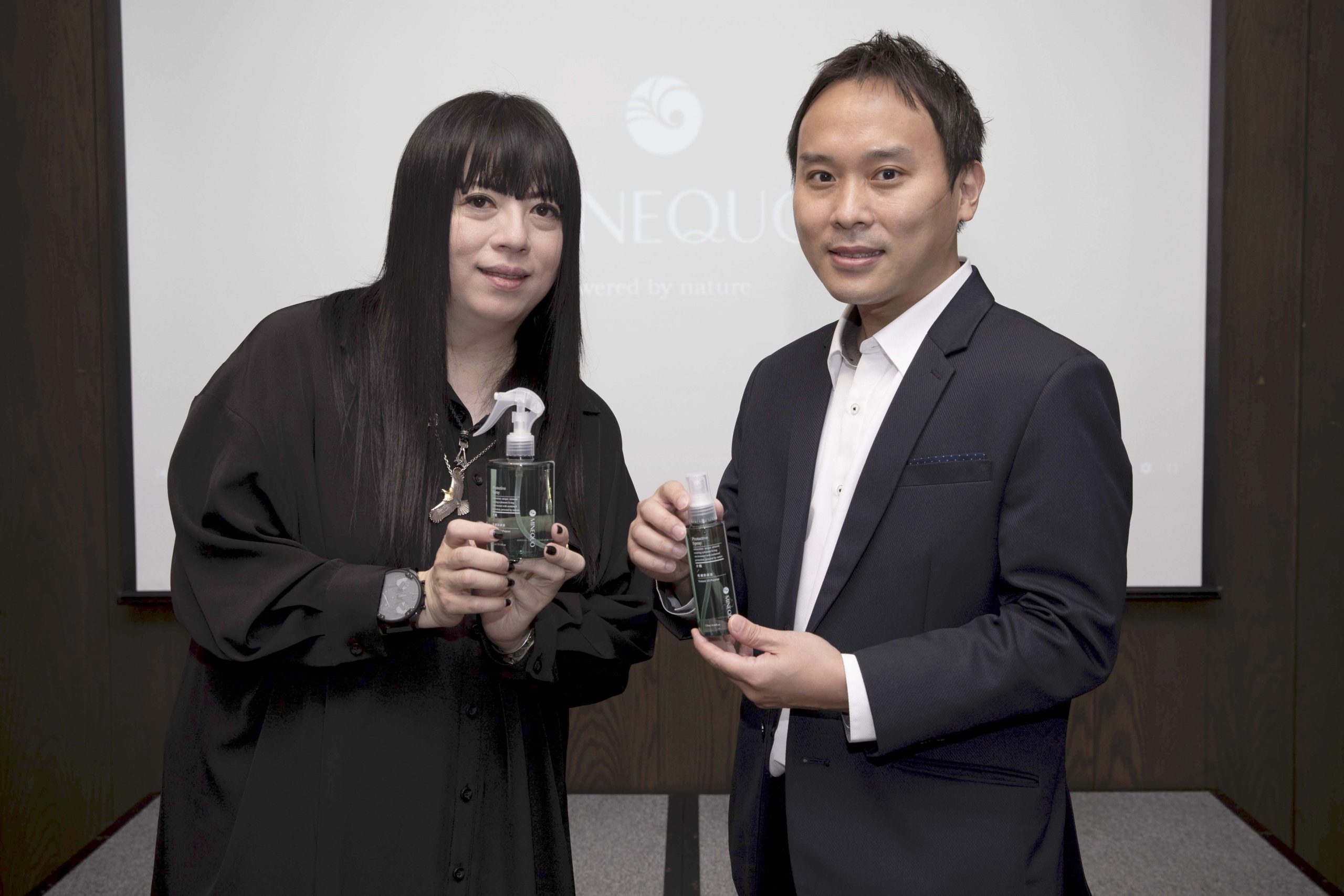 ▲MINEQUO米奈可品牌創辦人王俊卿與GIOIA PAN潘怡良設計師,共同展示MINEQUO「介觀植礦防護液」(圖/業者)