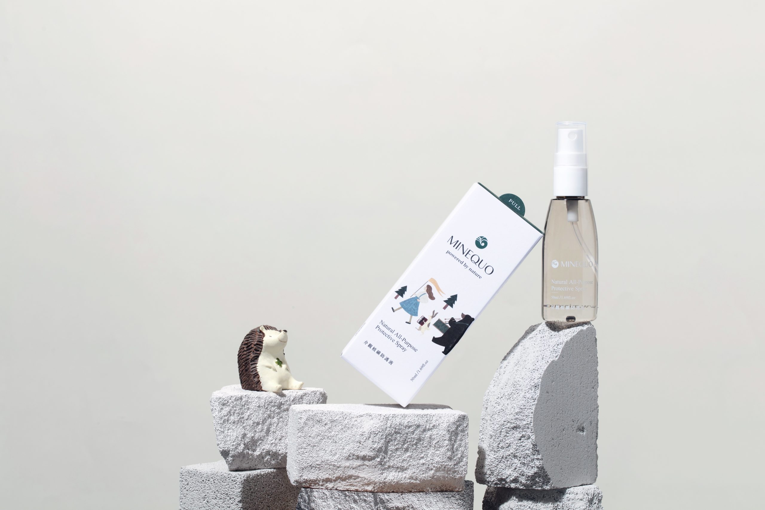MINEQUO米奈可,品牌視覺以舒適的綠色包裝及簡約線條去設計,符合時下大眾對於簡單即是美的審美,產品本身以日本「介觀構造保存技術」,從植物萃取碳酸氫鈣以介觀構造型態保存,製成天然不含化學藥劑的防護液及抗菌石。