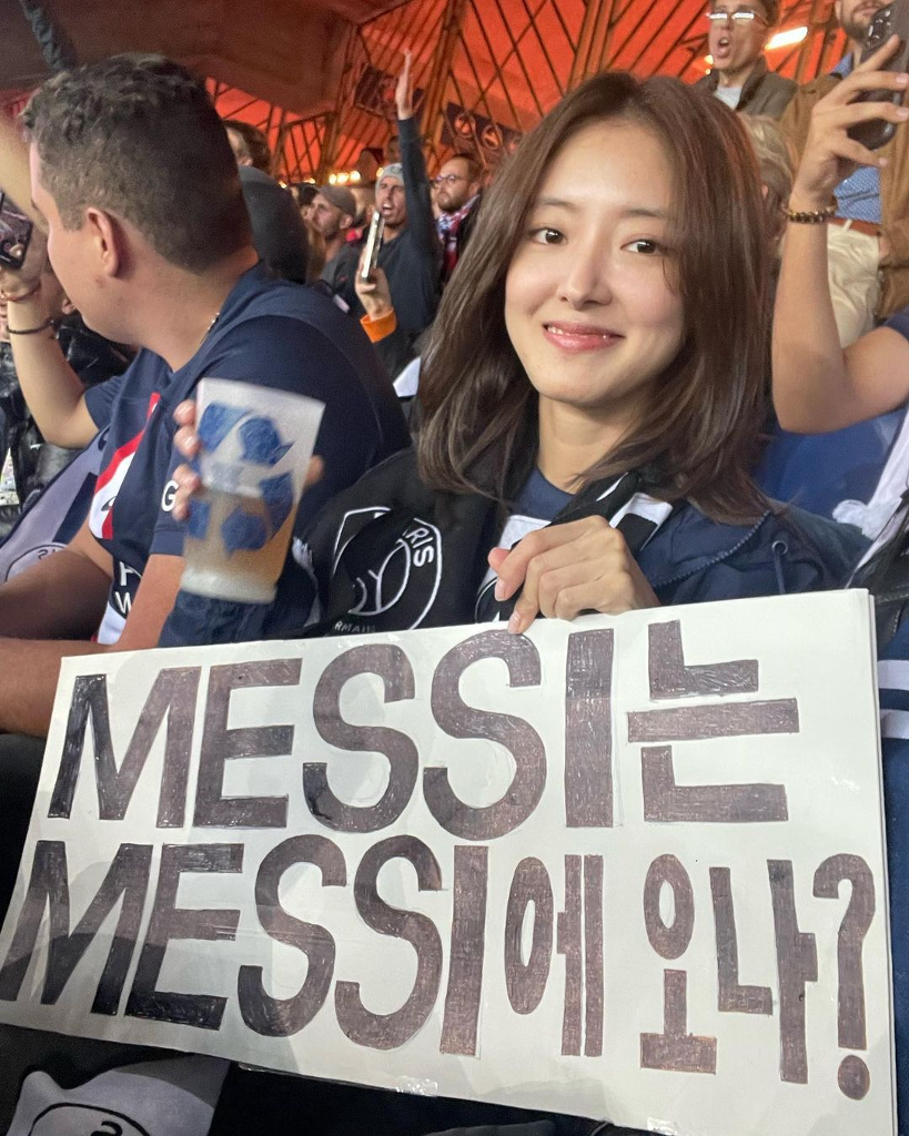 世榮」,李世榮更於25日白天在自己的IG上傳了身處法國巴黎「王子公園體育場」觀看法國足球甲級聯賽的一系列照片、影片,只見她不僅身穿巴黎聖日耳曼隊阿根廷傳奇球星「萊納爾·梅西」的球衣,還手持著用英、韓文寫著諧音哏「梅西幾點來?」的手幅展現韓國大叔式搞笑,短時間內立即獲得各國粉絲按讚達6位數,並有看得懂這個搞笑哏的粉絲以韓文寫下留言「ㄎㄎㄎ