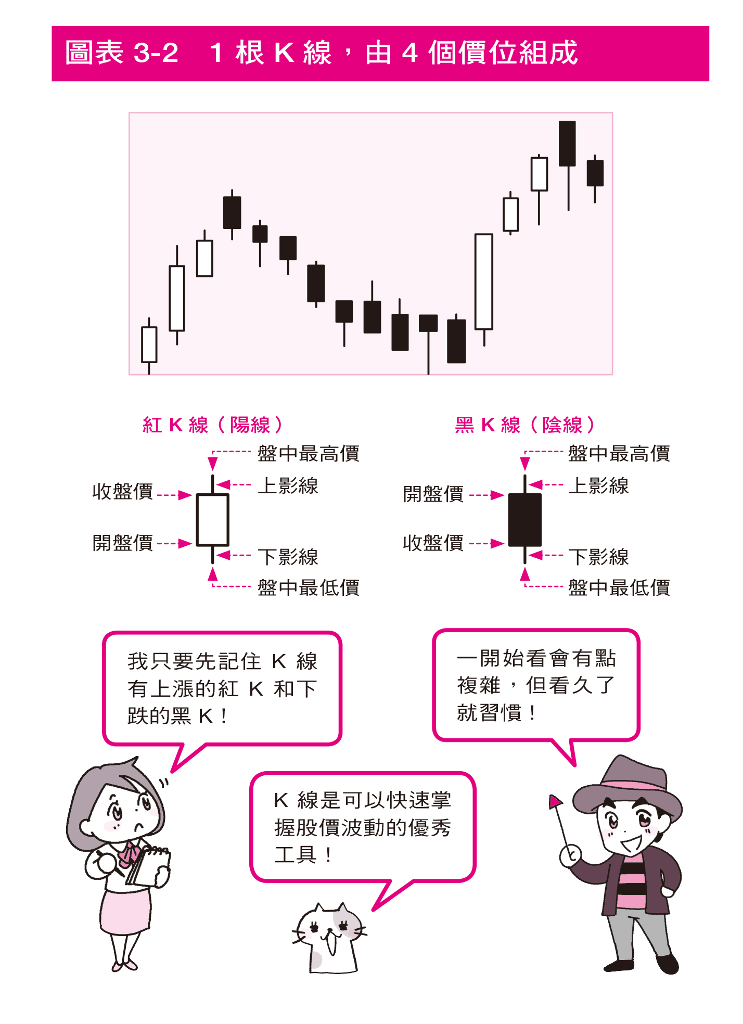 Lok老師:K 線有紅、有黑。收盤價高於開盤價時,K 線就會是紅色,相反的,收盤價低於開盤價時,K 線就會是黑色(按:代表這段時間內,股價趨勢為跌勢)。