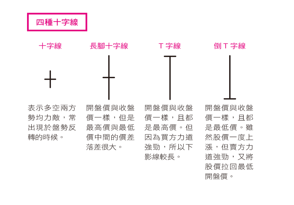 Lok老師:答對了。我來做個整理。K 線包含 4 種股價資訊,其中又可分成下頁圖表 3-4 的 8 種型態。不過,還不只如此。當開盤價等於收盤價時,K 線就不會有實體,而是變成一條線。但這條線如果還有上影線和下影線,就稱為「十字線」。