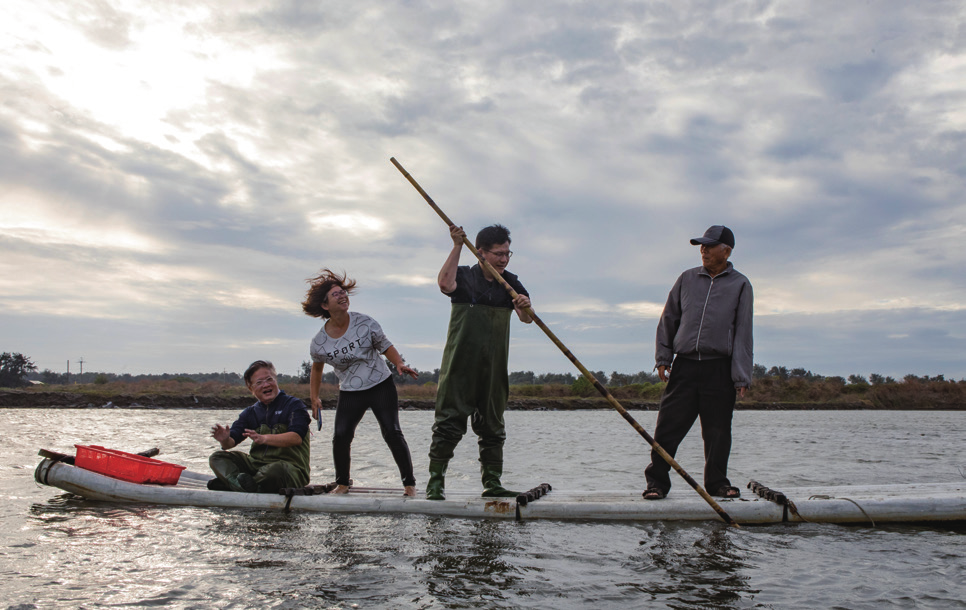 ▲ 鄭怡雯(右二)將魚塭養殖日常變成獨特體驗,帶觀光客搭竹筏、摸蛤蜊,前交通部長林佳龍造訪體驗時,也大讚新鮮。(圖:布克文化)