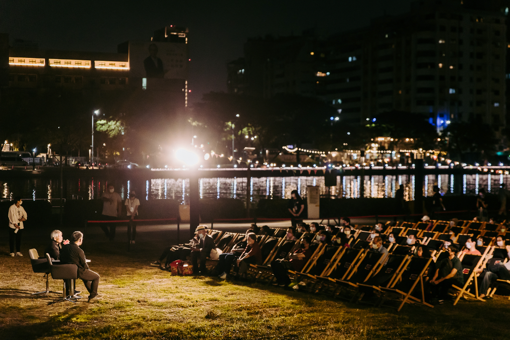 ▲ 《八百壯士》於1976年拍攝時就在愛河畔取景,事隔四十年重回拍攝地放映,意義非凡,現場觀眾斜躺舒適的大躺椅,伴隨微風與金馬攝影林文錦老師參與,氣氛舒暢。(圖:國家影視聽中心)