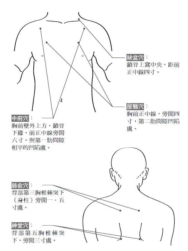 穴療要點:太淵穴、水突穴、缺盆穴、屋翳穴、中府穴、肺俞穴、神堂穴