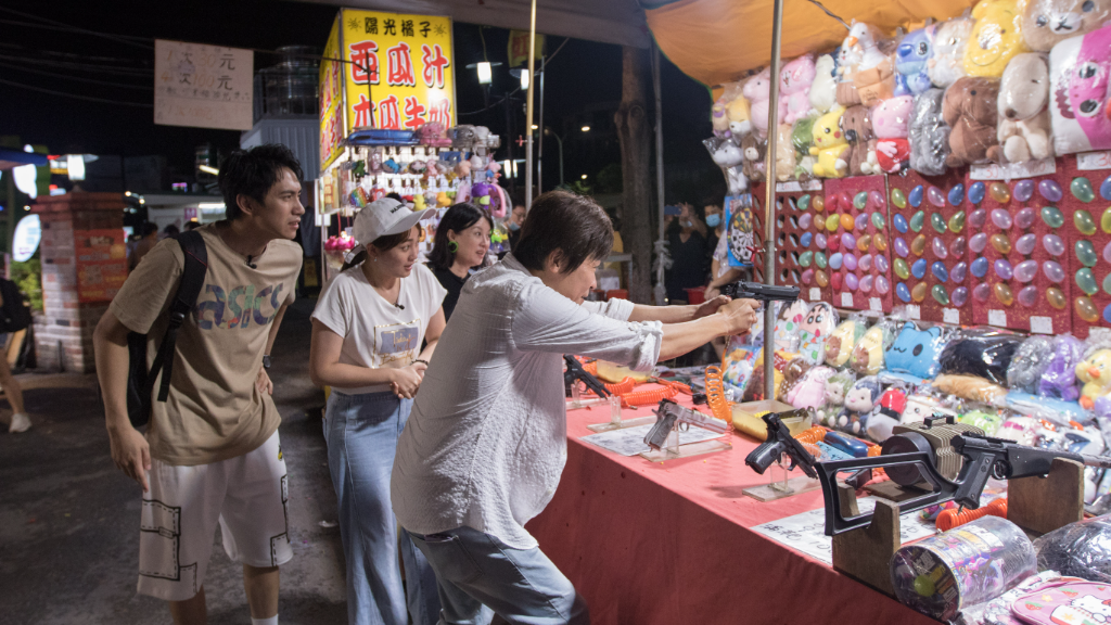 ▲ 洪榮宏(右)在夜市大展身手,旅伴在旁加油打氣。(圖:MyVideo)