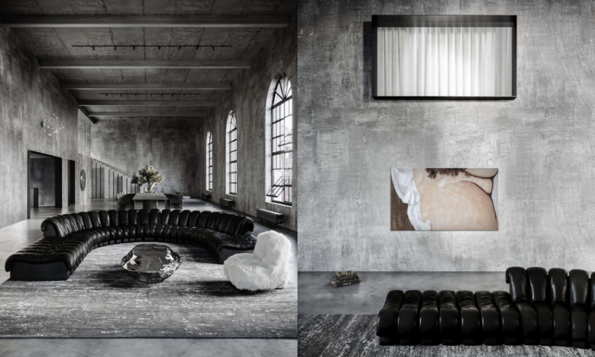 在這看似粗曠的室內隱含嚴謹的選擇與充滿詩意的藝術品。客廳中央擺放一張70年代經典的模組化皮革沙發,巨大而具有曲線的設計不僅大器優雅,彎曲的造型亦增進家人互動的親密感;從沙發、桌椅到地毯的顏色選配皆有連續性,僅用黑、白、灰色加深畫面的明暗對比。而內側面大膽的掛了一幅截自《世界的起源》(L'Origine du Monde)的畫作,為客廳帶來鮮明而獨特的藝術性。
