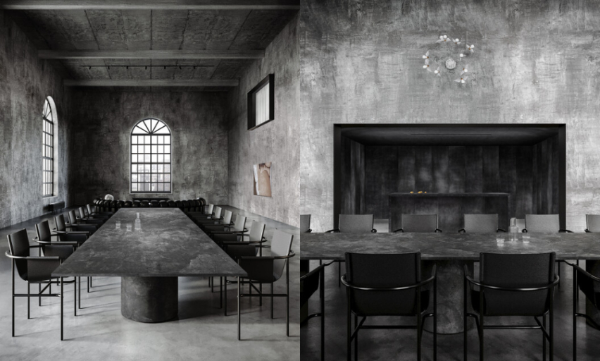 從客廳一路往前走,便來到用餐區域。長形而巨大的黑色大理石長桌作為理性的象徵,牆面上雖然有幾盞巧的壁燈,卻無法實際達到照明的作用,不禁在這灰暗的空間內感到空虛。在樓梯旁的空地內種植了一棵老橄欖樹,坐在樹下的木造座椅上,由不得感受到大自然的神聖感;一旁牆面則擺設一面「非鏡子的鏡子」,引發人深入去探索自身的思想並靜下心感受這個場域所產生的能量。