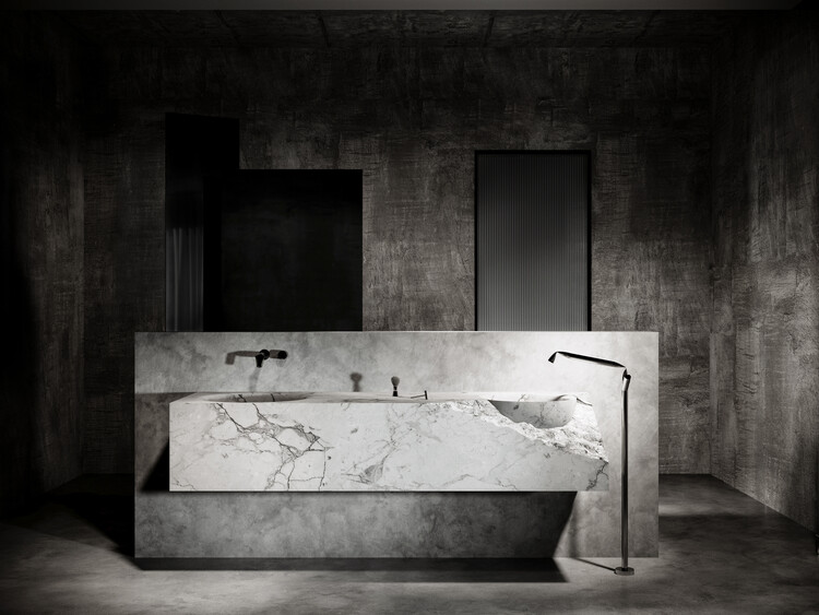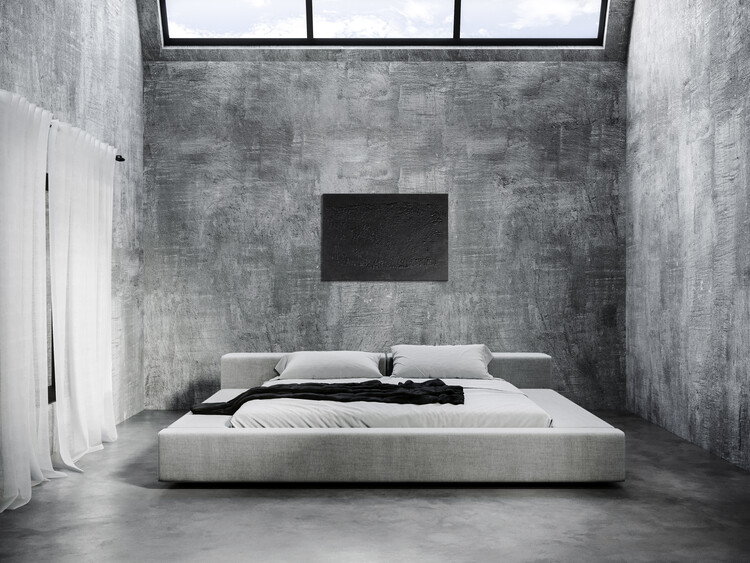 樓梯設計以水磨石台階層層排列,向義大利著名建築師為威尼斯設計的Olibetti陳列室的經典台階設計致敬。順著樓梯拾級而上,便來到臥室空間,臥房內僅簡單擺放一張寬大的灰色雙人床,並沒有其他家具的擺設。一旁浴室中央的大理石水槽佔據了大部分的空間,給人帶來強烈的視覺衝擊。在這間灰黑色調的居家空間內,透過滿與空的、明與暗的對比豐富了整體空間的面貌。