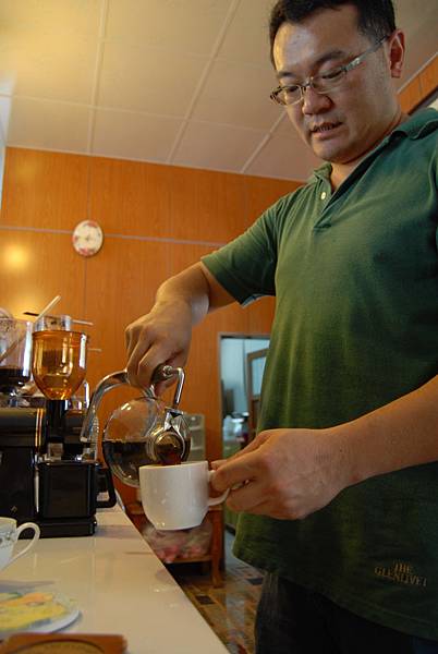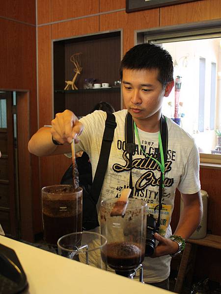主人詹先生說,沖泡好咖啡除了器材之外,時間的掌握是關鍵,於是我們一群人跟著一起「學功夫」。先將水煮沸後加入咖啡粉攪拌,等待60秒再關火,香醇的好咖啡就完工啦!