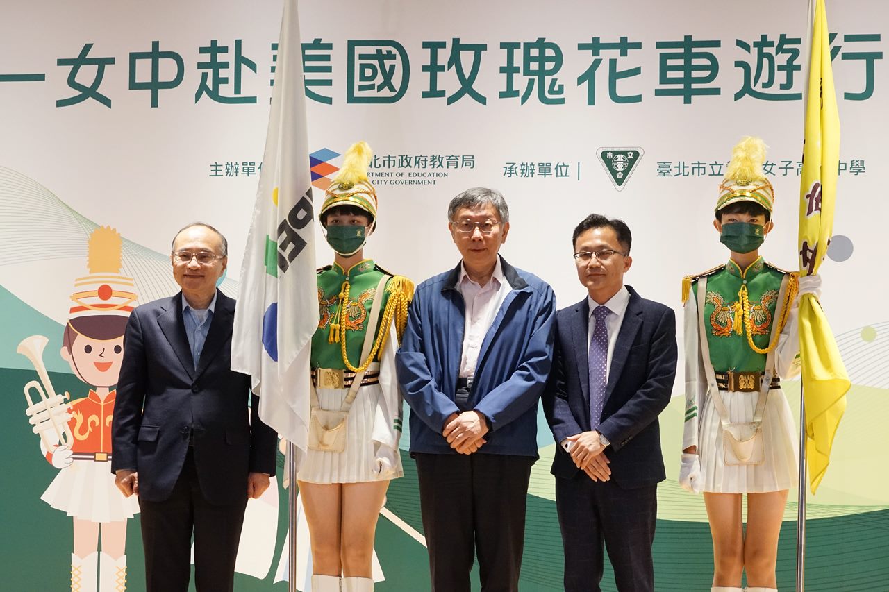 北一女樂儀旗隊睽違18年受邀參加美國玫瑰花車大遊行 柯文哲致詞時表示非常榮幸能為大家授旗,北一女樂儀旗隊要代表臺灣參加美國洛杉磯玫瑰花車遊行的隊伍,這場遊行現場將會有幾十萬人參與,透過螢幕轉播,全世界更將有幾千萬人會看到這場精采的遊行。這是臺灣經過18年後,再次受邀參加,也是臺灣唯一獲邀的隊伍。