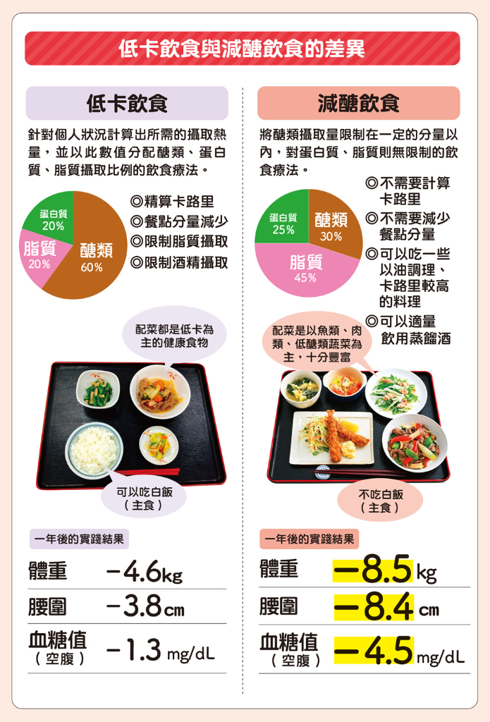 目前在日本,針對肥胖及糖尿病最常見的飲食療法是低卡飲食法。這種飲食法是針對個人狀況計算出所需的攝取熱量,並將三大營養素均衡分配(醣類60%、脂質20%、蛋白質20%)。另一方面,減醣飲食則是將醣類控制在定量以下,對蛋白質、脂質則沒有特殊限制。