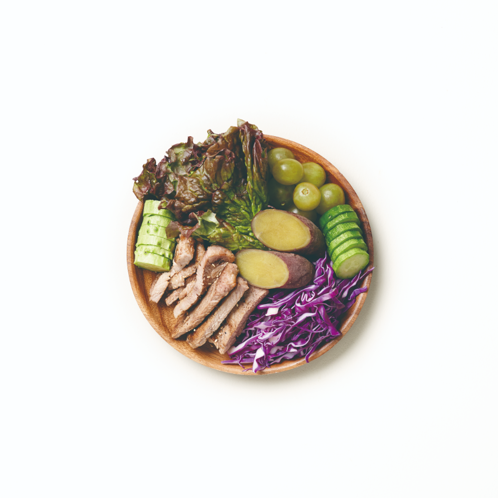 食材:萵苣6片、小黃瓜1條、蒸地瓜1條、紫甘藍1把、綠葡萄1把、豬頸肉100克。需要調理:❶ 將豬頸肉放在已經預熱的平底鍋上,以小火翻炒。❷ 拿出已經準備好的食材,一起裝盤享用。