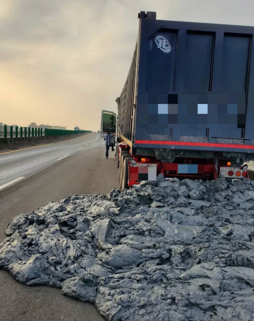 一輛滿載泥漿砂土的砂石車今天行經台61線西濱快速道路南下246公里雲林金湖段,疑因車斗鬆脫,大量泥漿砂石一路狂洩在路面,快道變泥路。記者蔡維斌/翻攝