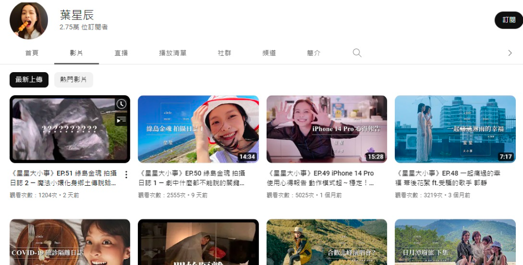 目前她也自己經營YT頻道,無奈大喊:「經營YT真的好難,點閱率一直衝不起來。」說起開始經營頻道的緣由,起因多年前參與「植劇場」演出時,希望透過影片,讓大家認識自己,從那時候就一直製作影片到現在,議題包括旅行、吃東西、煮飯。葉星辰無奈表示,很認真拍片的時候,網友覺得很無聊,但隨便瞎拍的影片,點擊率卻很好。