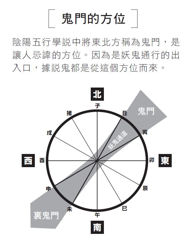 陰陽五行學說中將東北方稱為鬼門,是讓人忌諱的方位。因為是妖鬼通行的出入口,據說鬼都是從這個方位而來。