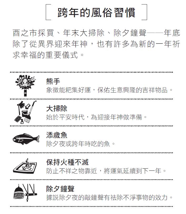 酉之市採買、年末大掃除、除夕鐘聲――年底除了從異界迎來年神,也有許多為新的一年祈求幸福的重要儀式。