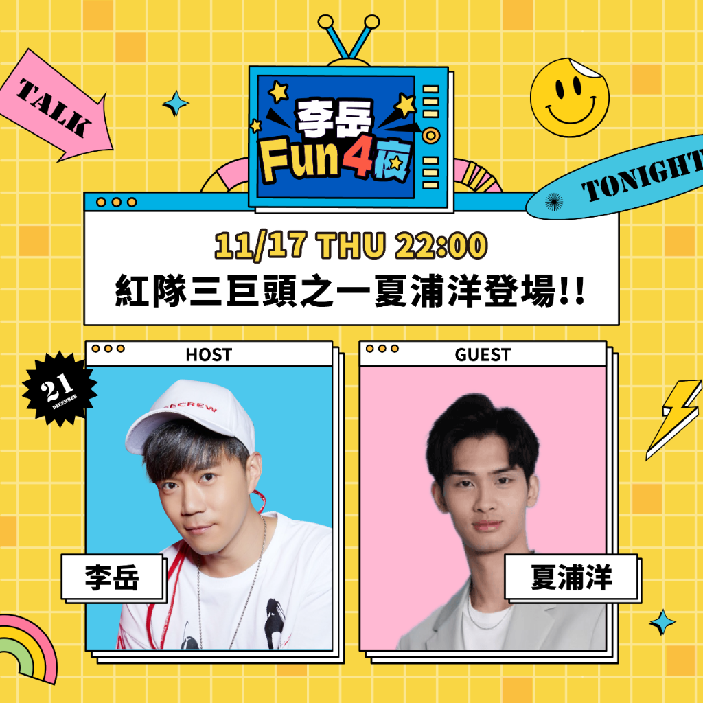 男星李岳持續成功拓展主持活動之外事業觸角,目前斜槓身份包括主持17直播人氣談話節目《李岳Fun4夜》、經營舞蹈教室、主持電台節目、繪本作家等,接下來還計畫著開幼稚園,《李岳Fun4夜》接連訪問多位新生代女歌手後,本週11月17日(四)晚間十點將迎來《全明星運動會4》紅隊三巨頭之一、新生代人氣偶像原子少年夏浦洋上線訪談,李岳開心他收集訪問原子少年成員的大計又將邁進一步。