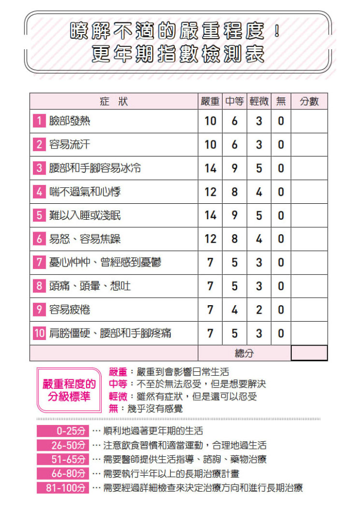 下列表格將更年期症狀的強度分成4個階段,勾選符合自己的情況並且計算總分,總分若超過50分,建議前往婦產科諮詢。