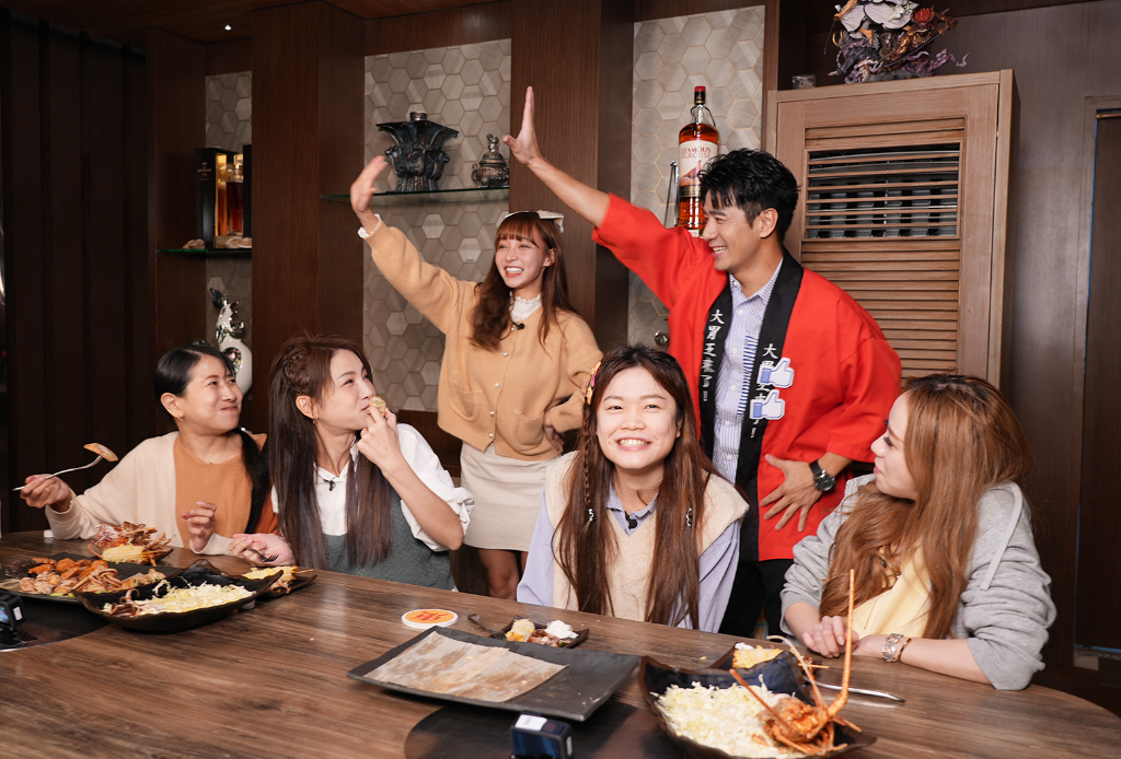 ▲ 林襄替大胃王加油 (左起)大胃王芳芳、大胃王邵阿咩、來賓林襄、大胃王小慧、主持人郭彥均、大胃王張語昕。(圖:緯來綜合台)