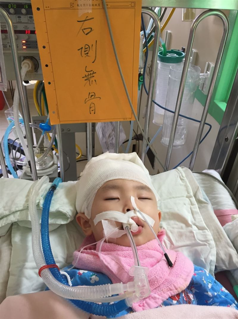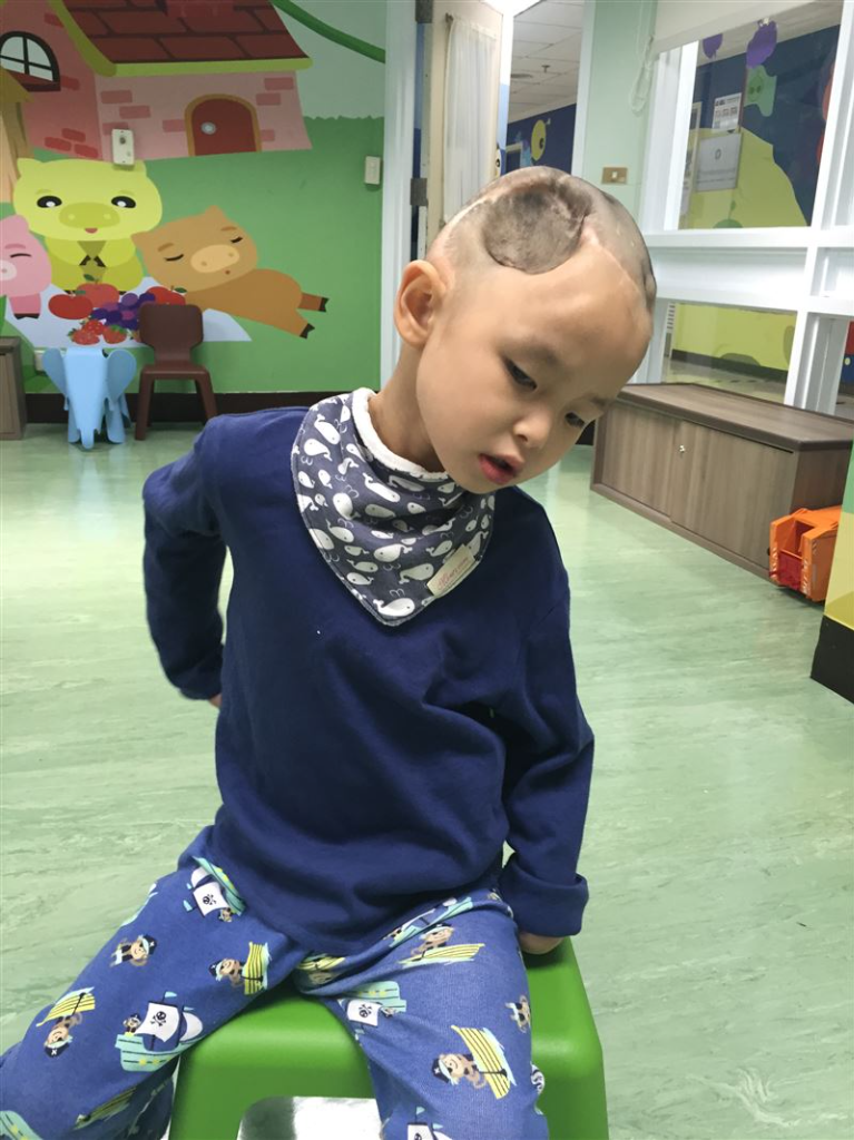 小mu在加護病房和死神搏鬥,住院超過100天,看著寶貝兒子昏迷不醒,手術時血淋淋的腦部傷口,小小身軀躺在床上還插了那麼多管線,媽媽的心一度被徹底擊垮,那真是誰也無法體會的心如刀割。至今小mu腦部開刀13次,右腦也完全被切除,造成他左側肢體偏癱、雙眼失明,語言和認知能力也完全退化。