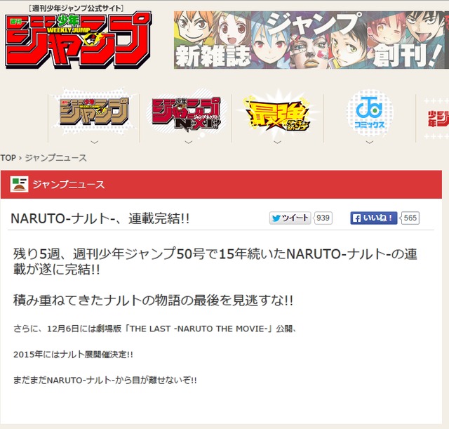 由岸本齊史所著經典忍道漫畫《火影忍者》,在十月第一週週刊少年 JUMP 官網上,預先公開了作品將於 11 月 10 日發售的週刊少年 JUMP 50 號刊上,結束自 1999 年以來,長達 15 年連載的消息。