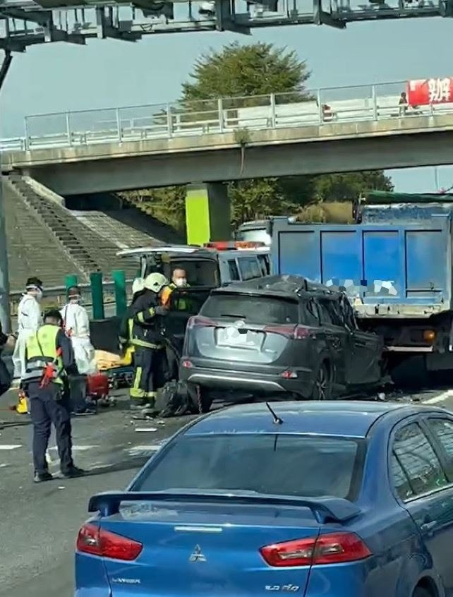 今(5)日下午1點29分左右,中山高北上247.2K斗南地磅站前發生車禍,林姓男子駕駛深色休旅車高速追撞前方大貨車,休旅車頭直接插入大貨車後方,駕駛受困。