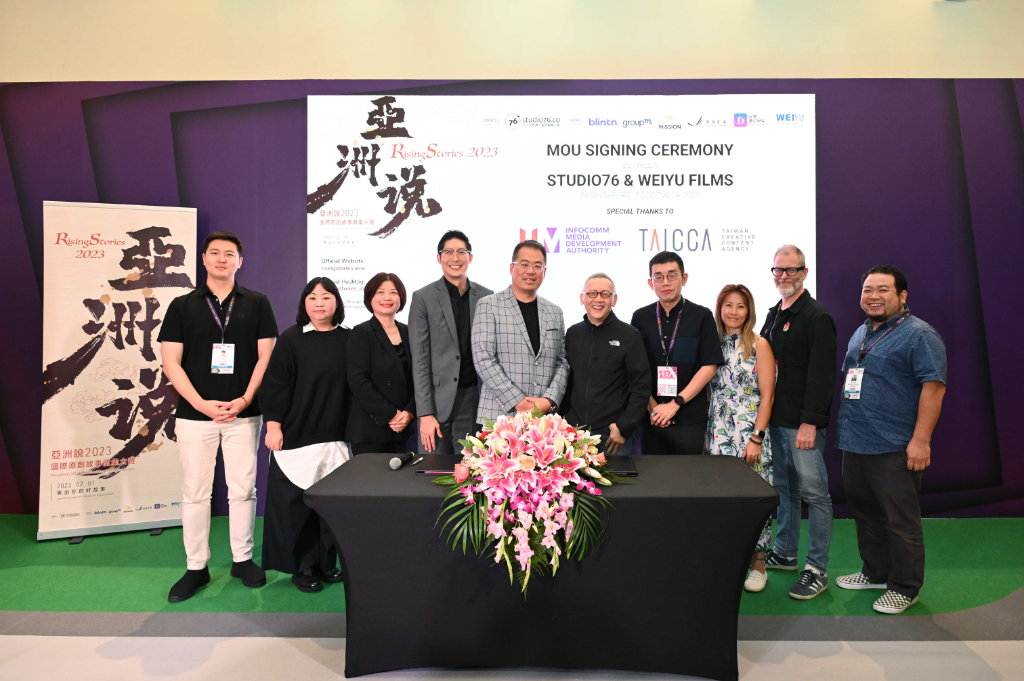 台灣的七十六號原子與新加坡的潙堯電影Weiyu Films今日(12/7)於新加坡亞洲電視論壇及內容交易市場舉行簽約儀式,宣布由他們攜手舉辦的『2023亞洲說 國際原創故事徵集大賽 』(2023 RisingStories Story Pitching Competition)將隆重舉行。希望能挖掘最具創意的故事與劇本,開發成全球市場都受歡迎的電影長片或電視劇集。活動中也邀請到IMDA新加坡資訊通信媒體發展局 助理局長洪慶忠,與TAICCA文化內容策進院院長 李明哲出席此次簽約儀式。