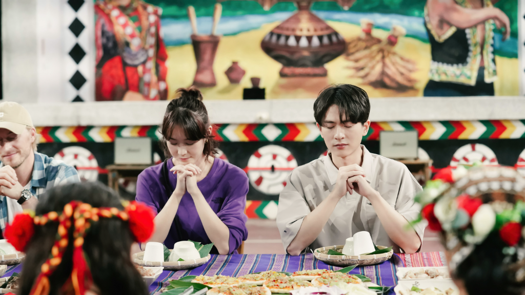 ▲ 鍾瑶、石知田入境隨俗進行飯前的祈禱。(圖:東森)
