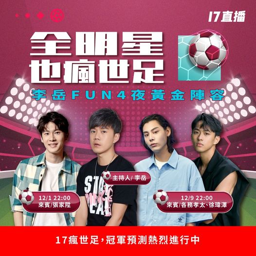 ▲ 各務孝太、徐瑋澤17LIVE《李岳Fun4夜》一起瘋世足。(圖:17LIVE)