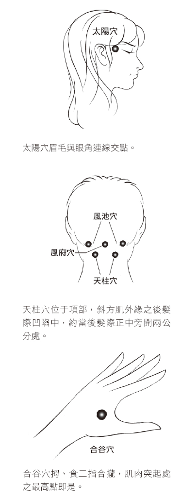 ▲ 想緩解感冒時的疼痛,頸背兩側的痛點、太陽穴、天柱穴、風池穴與合谷穴的自我按摩,臉部熱敷、雙掌搓揉臉部及肩頸部位也很有效。(圖:柿子文化)