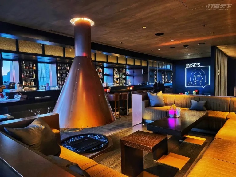 台北萬豪酒店位於20樓的INGE'S Bar & Grill奢侈坐享遼闊無遮蔽的千萬夜景,也因為無高樓阻擋,高空酒吧戶外露天區風也大,最受歡迎為中間靠窗位置的室內休憩區,飽覽一大片璀璨夜色,亦可隨時出入露台吹風賞景。五星級時尚空間由紐約知名設計公司Studio MH操刀,以「蜂巢」為發想,打造室內酒吧區、露台區、室內休憩區、私人用餐區4種特色區域。最經典的酒款服務就有3類:INGE'S獨家黃金比例烈酒、風味調酒和豐富酒藏,光是絕版稀有威士忌和拍賣紅酒就超過500款。(未成年請勿飲酒。酒後不開車,安全有保障。)