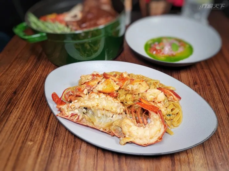 ▲ 龍蝦手工義大利麵 /2,980元。蒸烤新鮮波士頓龍蝦,初生蛋手工製作義大利麵吸飽以蝦膏、洋蔥、白蘭地等精熬獨門濃郁醬汁,滿嘴鮮香濃郁。(圖:行遍天下)