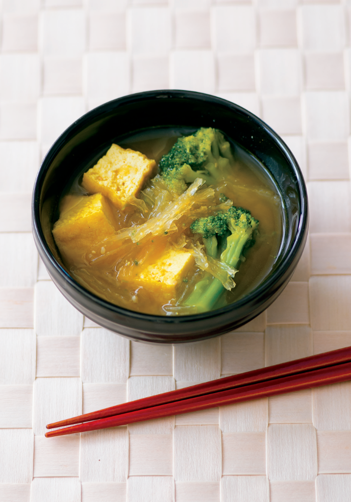 讓這道湯品更美味的祕訣就是用味噌提味。在辣辣的咖哩裡面加入味噌,融合味噌獨特的味道和香醇,就算沒有肉也很好喝。再加上與味噌很搭的油豆腐,份量就非常足夠了。最後加入寒天絲,增添Q彈的口感,豐富多樣的味道讓人一吃就忍不住浮現笑容。