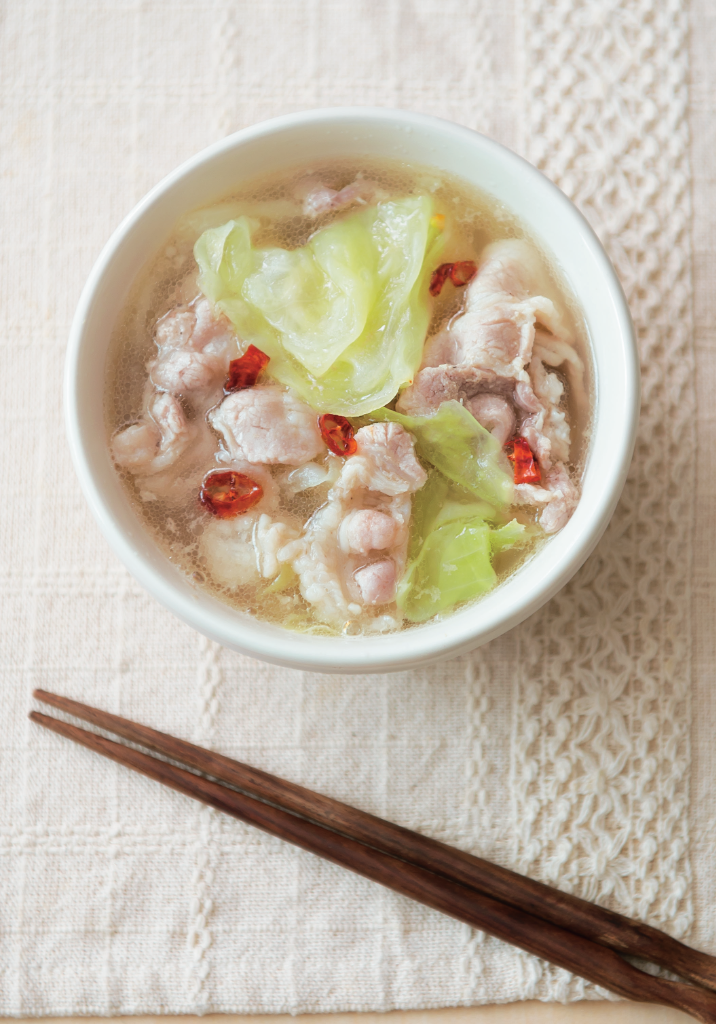 這道湯品更美味的祕訣就是大量使用高麗菜。高麗菜只要稍微煮一下,體積就會瞬間減少,還會大量吸收豬肉的鮮美精華,讓人吃個不停。想要更清爽的湯頭,可以加入檸檬片。檸檬釋放清爽的香味,一吃就上癮。