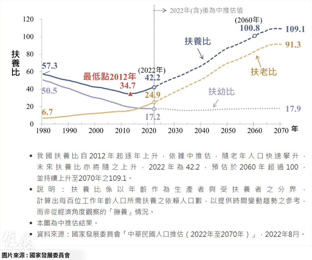 住展雜誌去年(2021)曾報導,因醫療進步、社會結構改變,我國青壯年人口的撫養負擔居高不下。而根據國發會最新統計,2022年總扶養比攀升至42.2%,即每100個有工作能力的人口,須撫養約42.2個依賴人口。總扶養比在近10年期間增加了7.5%,沉重的撫養負擔讓不少年輕人出現放棄努力的念頭,加入「躺平族」行列。