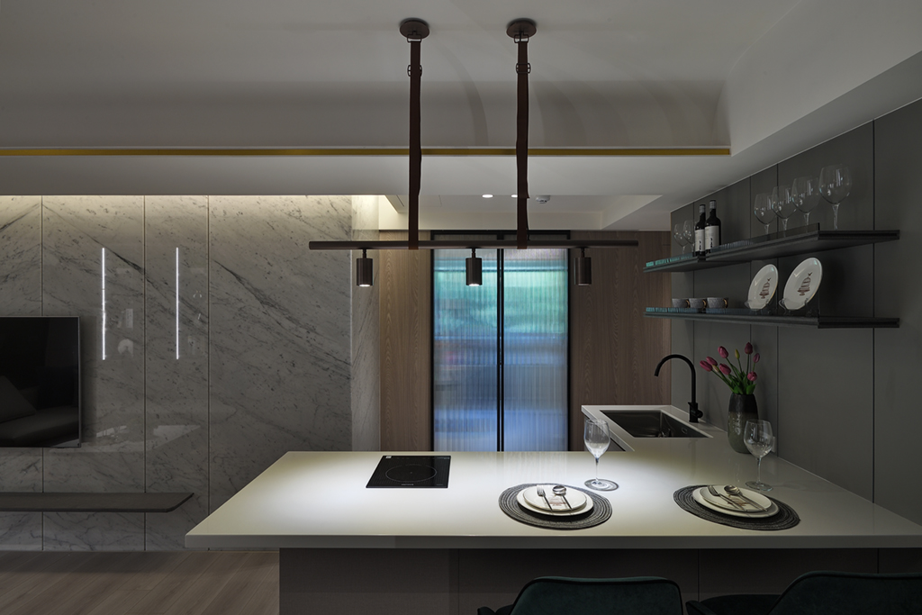 撇一眼便可見猶如吧檯的餐廚區,在燈光的烘托下顯得別緻。電子爐設備讓餐敘生活增添更多色彩,捨去過多的器具擺放,維持整潔俐落的餐桌風貌。
