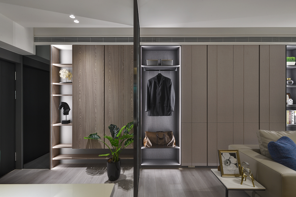 自玄關而入可見格柵玻璃與植栽,前者在保有玄關視覺機能的同時,也讓人感受到時刻來自家的環繞感。後者則為淡色家園增添一抹綠意盎然。