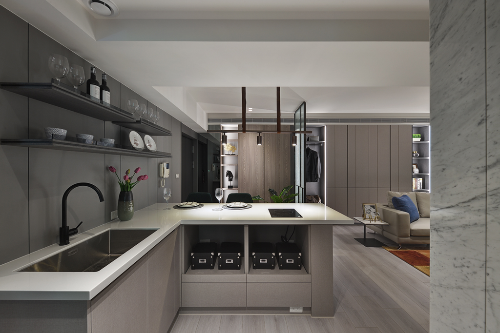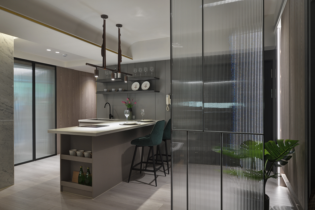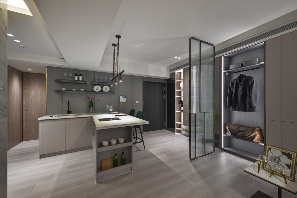 循著墨痕,一覽離生活最相近的景緻,只需以淺色清新妝點,便能勾勒藏於簡潔空間中的品味奢華。本案在開放式的空間格局間,運用格柵玻璃在視覺上區分不同場域,為生活展現寬敞舒適的樣貌之餘也界定機能空間感。