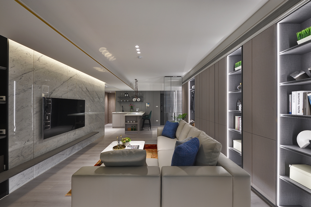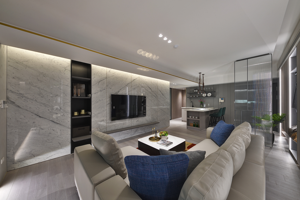 「卡拉拉白大理石」與生俱來的紋路中,總帶有一絲唯美和俐落,其所砌成的電視牆為客廳增添一分奢華,亦展現猶如山水墨般的底蘊。