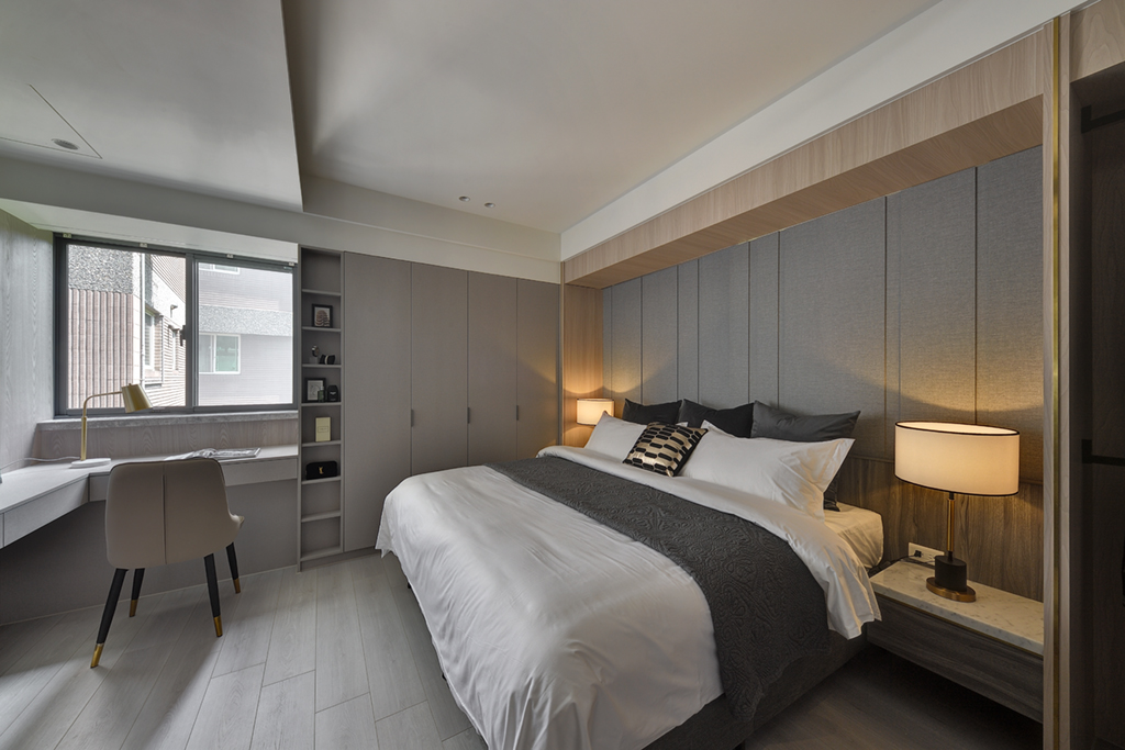 主臥房以明亮的白與灰作主色調,展示清新的休憩氛圍,讓生活的色調一如空間般富含快活個性。