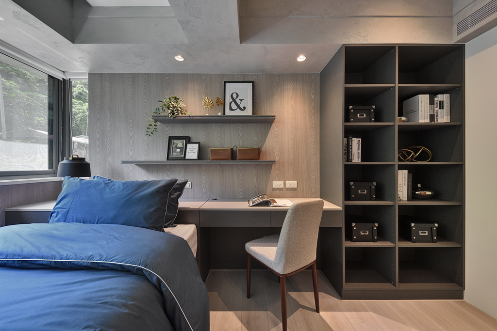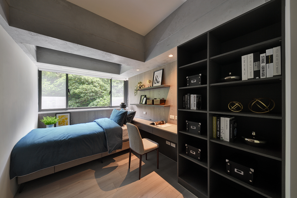 沈穩的深咖啡色與彰顯寧靜的海藍色,為次臥增添了靜謐的情緒,打造兼具休息、閱讀、收納與從事工作之空間。